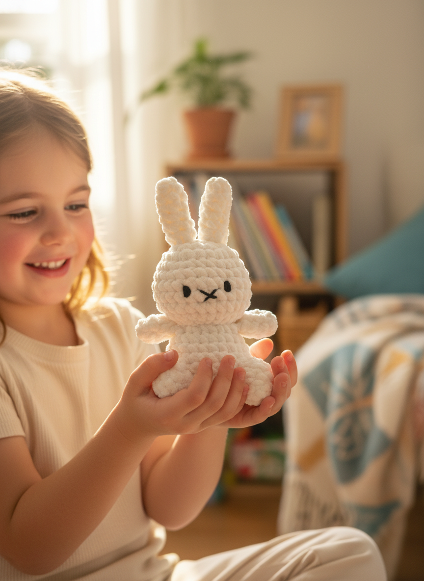 Craquez pour cet adorable miffy en crochet, entièrement fait à la main avec soin. Sa laine douce et son rembourrage léger en mousse en font un compagnon parfait, à offrir ou à collectionner.